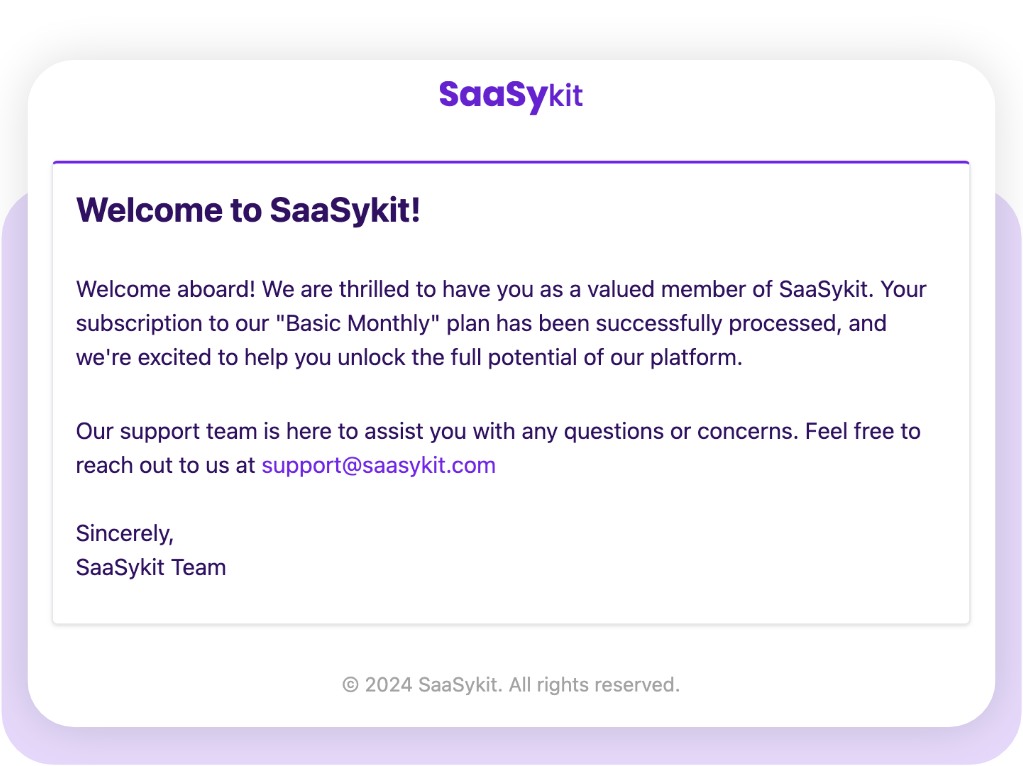 SaaSykit comes with a beautiful email template out of the box that takes your brand colors into consideration, along with the typical emails for customer registration, verification, resetting password, etc set up for you.