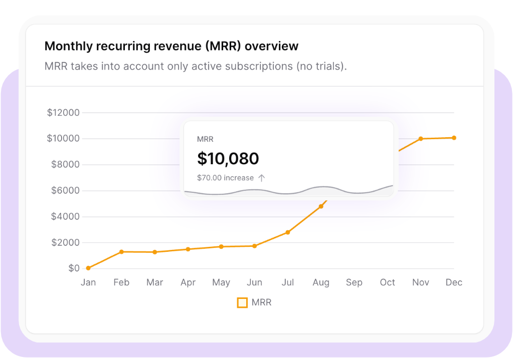 View your MRR (monthly recurring revenue), Churn rates, ARPU (average revenue per user), and other SaaS metrics right inside your admin panel.